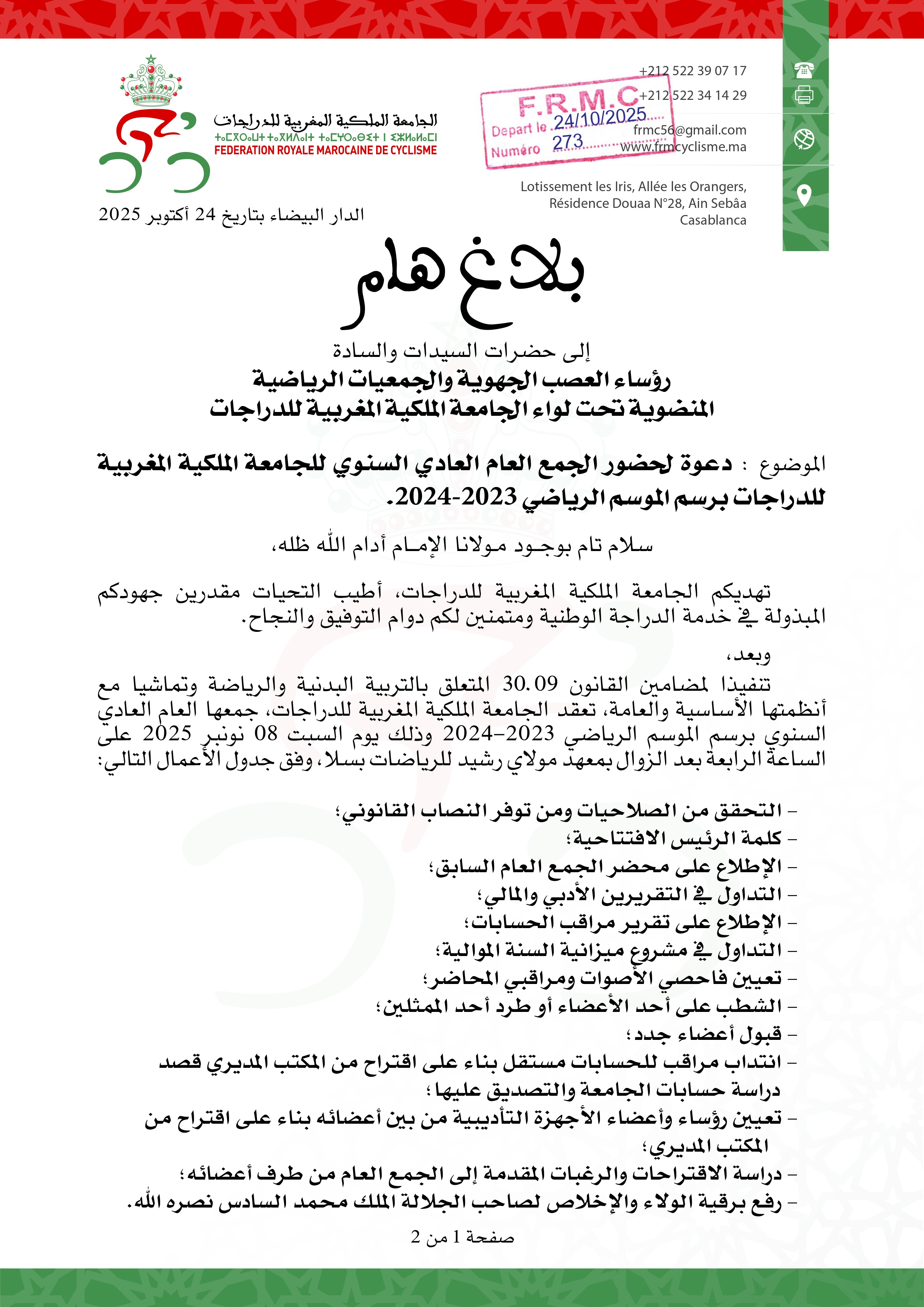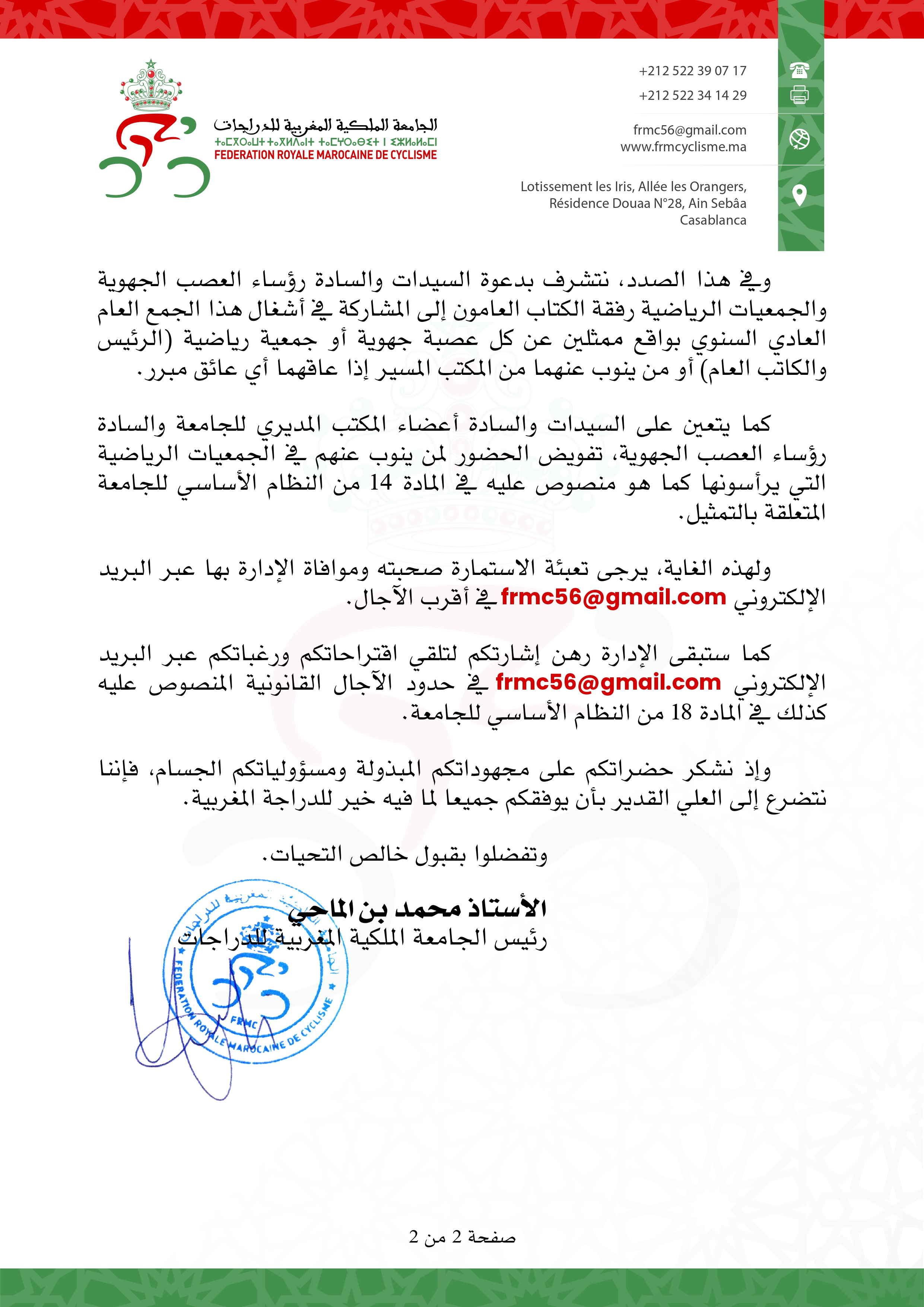 جامعة الدراجات تعقد جمعها العام العادي السنوي برسم الموسم الرياضي 2023-2024
